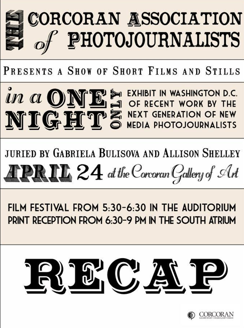 The Corcoran Association of Photojournalists hosted reCAP, a one-night-only exhibition featuring short films and stills at the Corcoran Gallery of Art. April 24 2013.